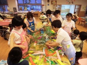 七夕会では願い事を短冊に書いて、みんなで飾りつけをおこないます。 |